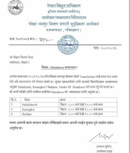 निर्धारित समयभित्र कार्य सम्पन्न गर्न सटडाउन गरिएको र कार्य चाँडै सकिएमा सोही अनुसार विद्युत् सेवा पुनः सुचारु गरिने नेपाल विद्युत् प्राधिकरण पोखरा वितरण केन्द्र, मालेपाटनले जनाएको छ ।