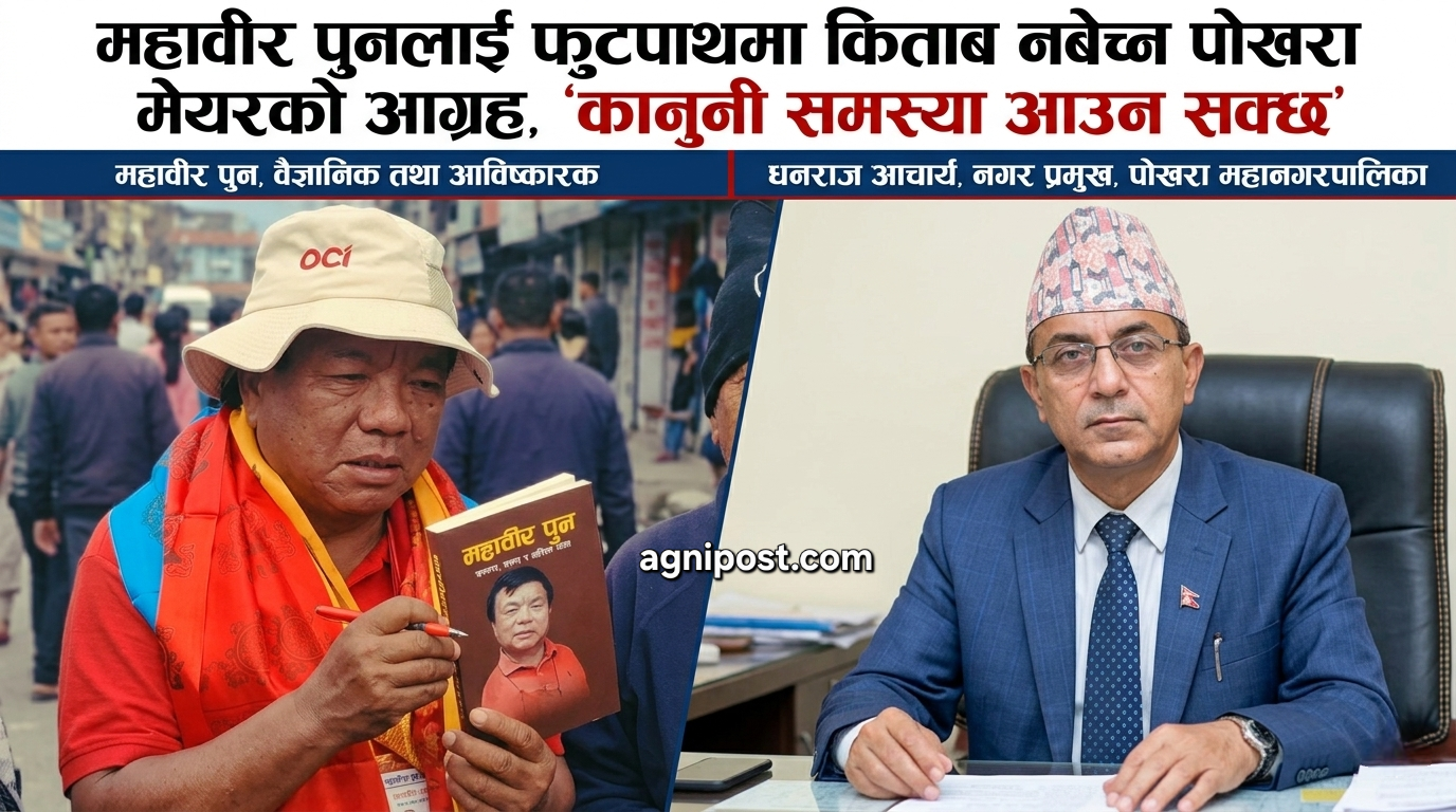 महावीर पुनलाई फुटपाथमा किताब नबेच्न पोखरा मेयरको आग्रह, ‘कानुनी समस्या आउन सक्छ’